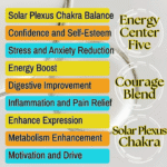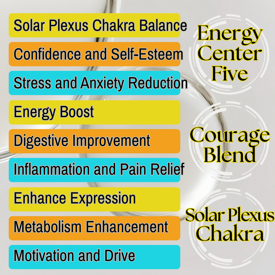This blend balances the Solar Plexus chakra, enhancing personal power, confidence, and self-esteem. It reduces stress and anxiety, boosts energy, and improves digestion and liver function. Additionally, it stimulates circulation, enhances metabolism, and increases motivation, helping to achieve goals and maintain overall well-being.