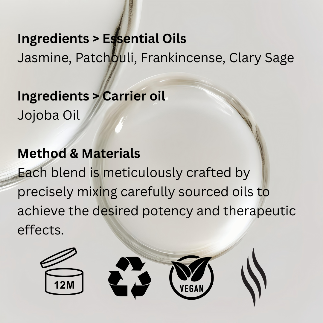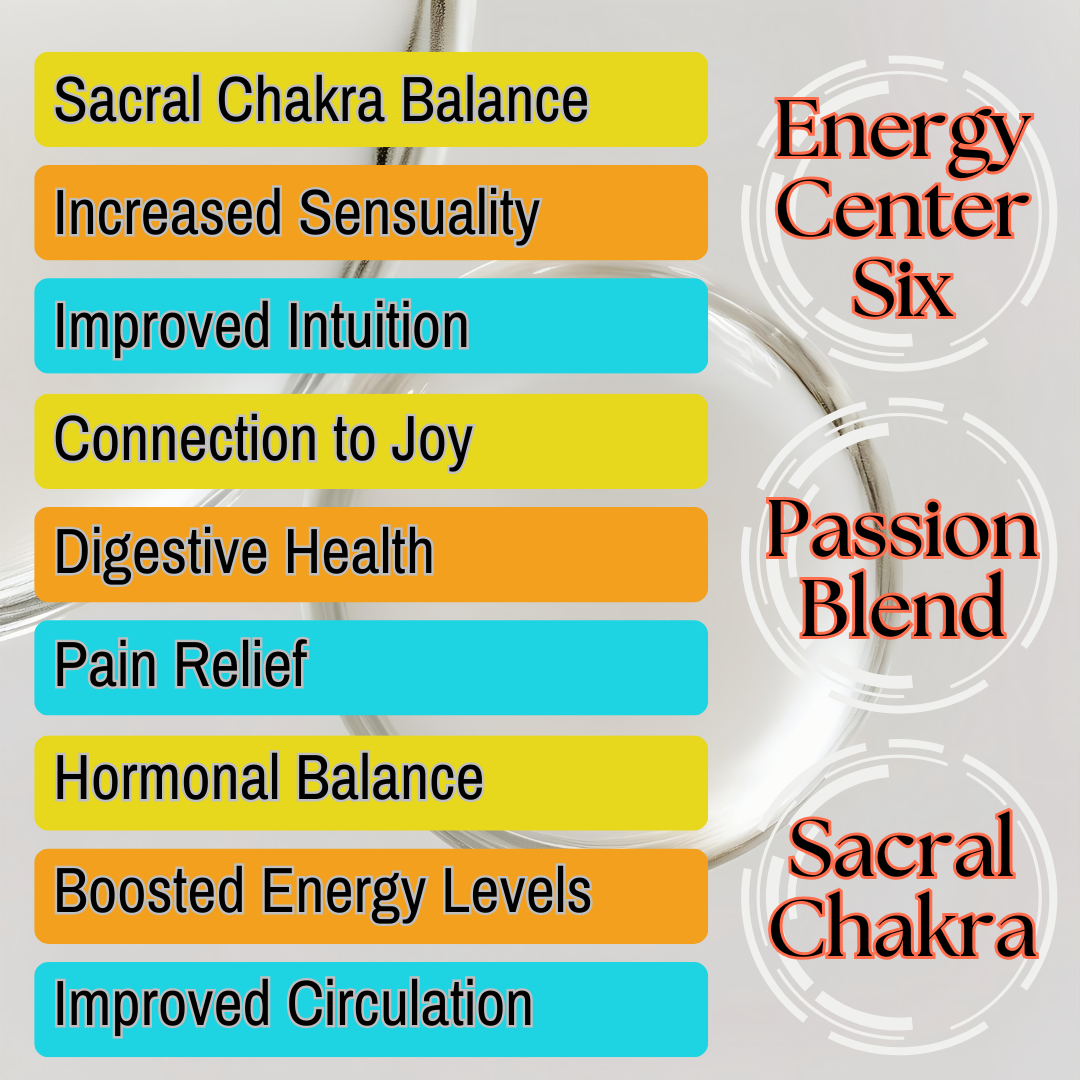 This blend balances the Sacral chakra, unlocking creativity, passion, and emotional well-being. It promotes sensuality, enhances intuition, and fosters joy. Additionally, it supports digestive health, alleviates pain, regulates hormones, boosts energy levels, and improves circulation, contributing to overall vitality and well-being.