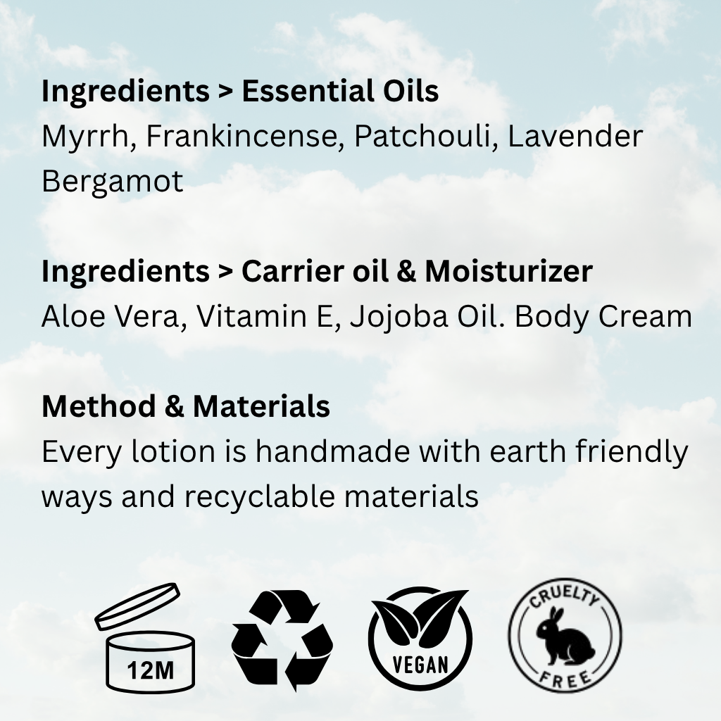 This youthful skin lotion features myrrh and frankincense to reduce fine lines and enhance elasticity, while lavender and bergamot promote a youthful glow. Jojoba oil hydrates, vitamin E protects, and aloe vera balances skin tone, making it suitable for all skin types.